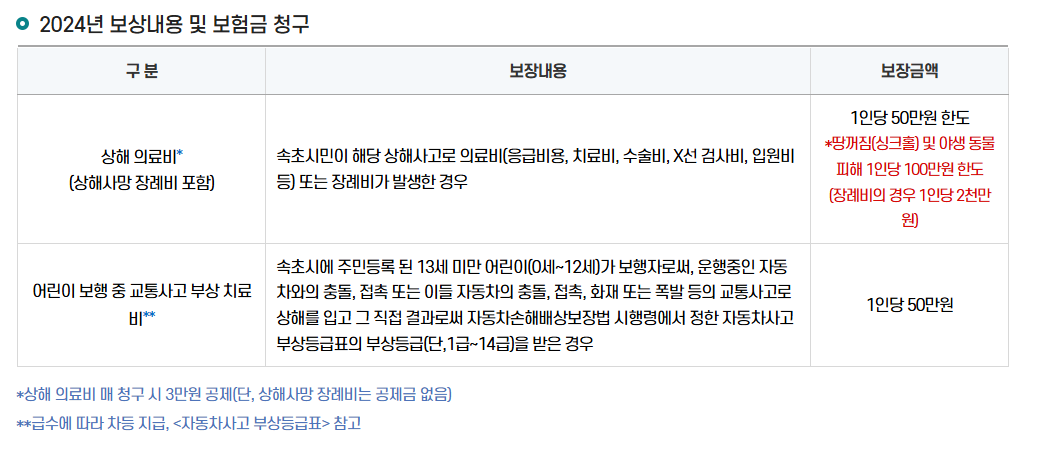 강원도 속초시는 13세미만 어린이가 교통사고로 상해를 입을 경우 1인당 50만원의 보장을 받을 수 있습니다.