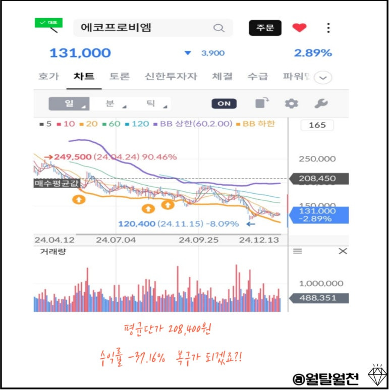 저는 2차전지 관련주인 에코프로비엠에 몇 주 정찰병을 보내 논 상태입니다.