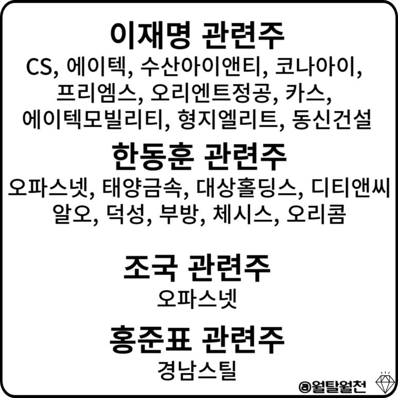이재명, 한동훈 등 한동안 이어질 정치 이슈 관련 테마주들은 어떤 것들이 있는지 간단히 정리해 봤습니다.