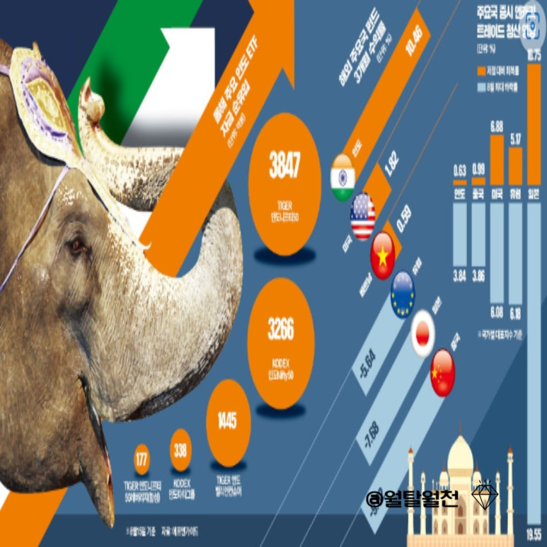 위의 대표적인 ETF외에도 인도 소비재 기업에 투자하는 ‘TIGER 인도 빌리언 컨슈머’(1445억 원)와 ‘인도의 삼성그룹’으로 불리는 타타그룹에 집중 투자하는 ‘KODEX 인도 타타그룹’(338억 원)에도 자금이 꾸준히 유입되는 추세입니다.