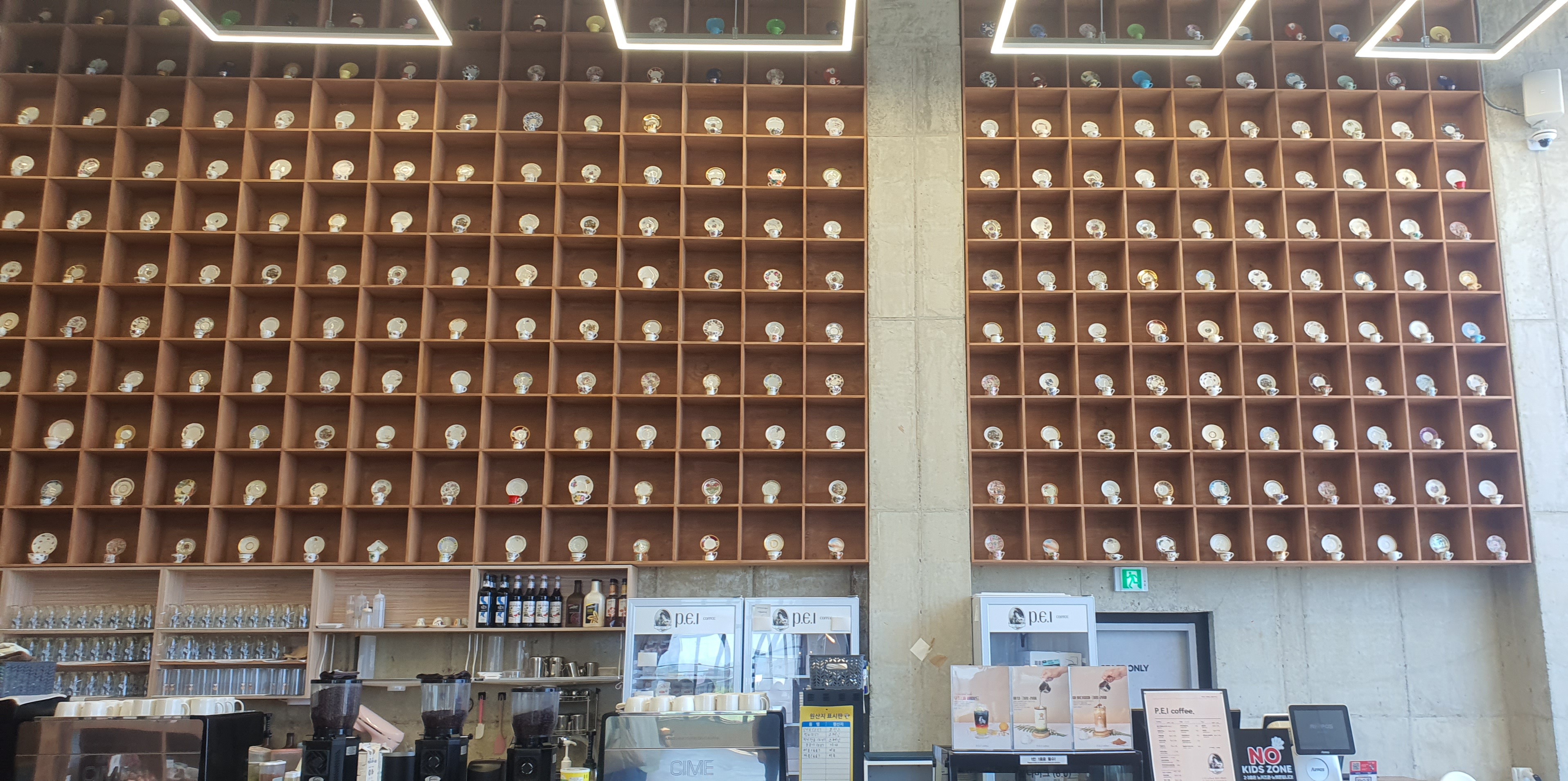 벽면을 가득 채운 저 컵들,,, 정말 멋있었어요. 층고가 4m는 족히 되어 보였습니다.
