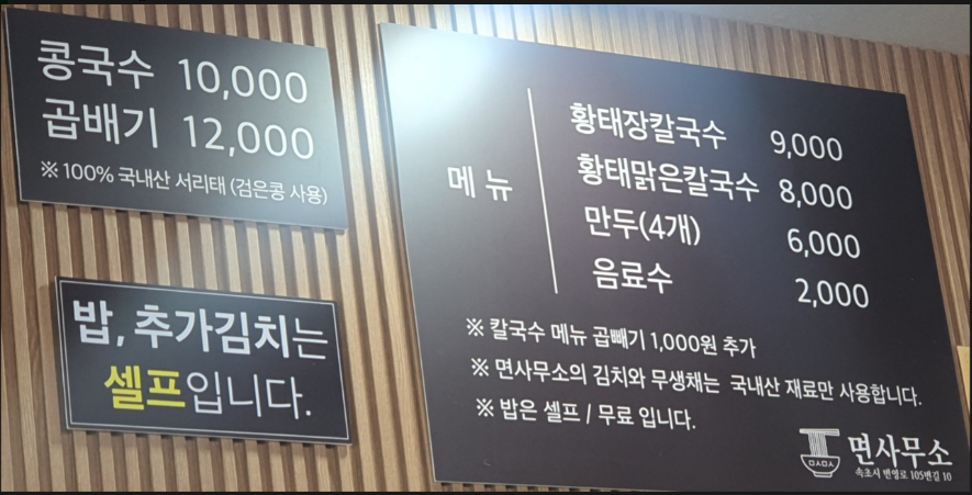 속초 국수 맛집 면사무소 내부 및 메뉴