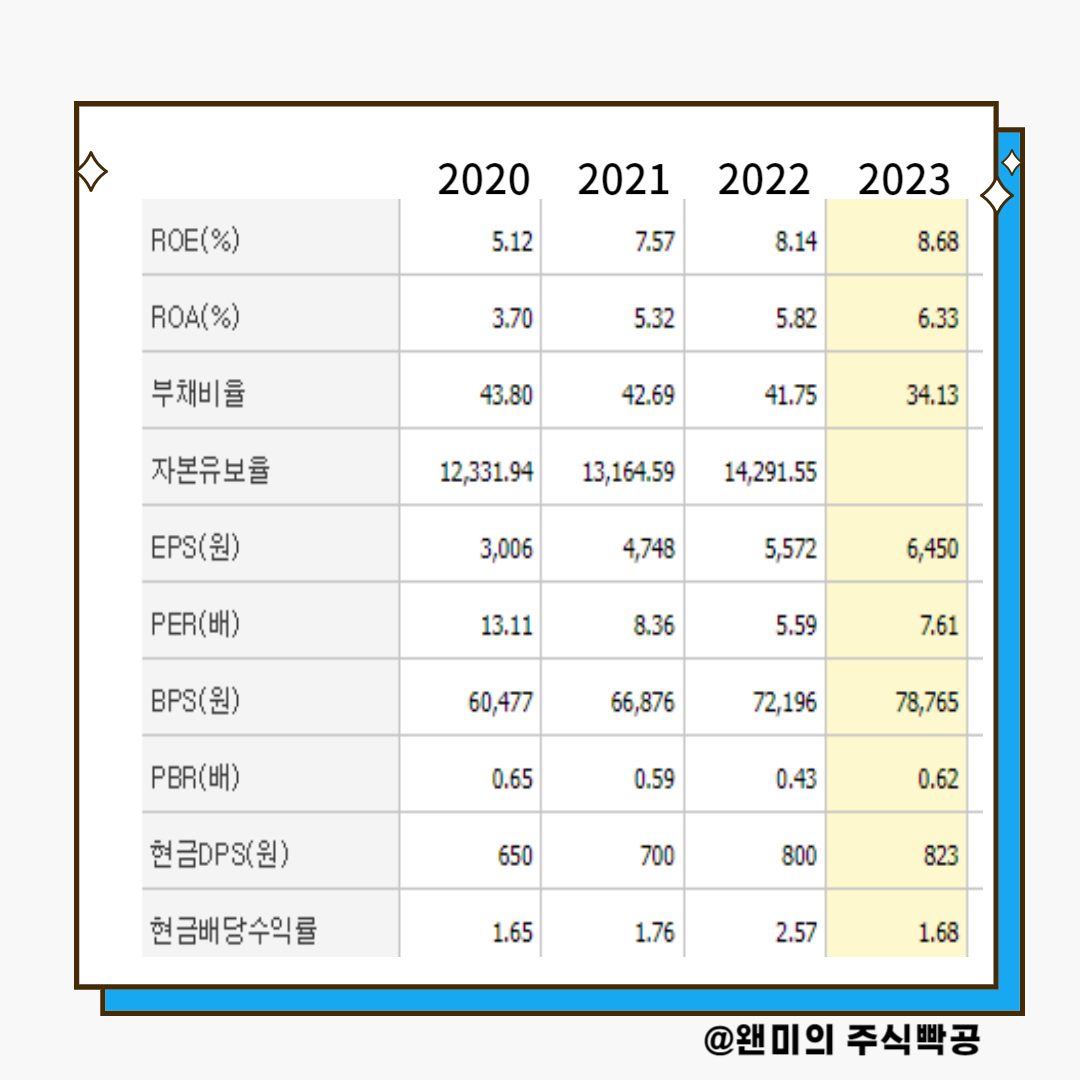 PBR 1배 이하로 저평가되었으며, ROE가 높다는 것은 기업이 안정적이고 효율적으로 수익을 창출해 주주환원 정책을 지속할 수 있다는 것을 의미합니다. 보통 ROE가 10배 이상인 기업을 찾으라고 합니다.