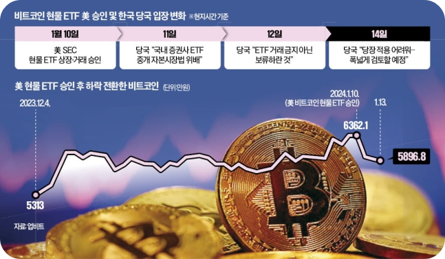 2024년 1월 15일자 한국경제신문에서 비트코인 현물 ETF 거래에 관한 한국 당국 입장의 변화에 대한 내용을 기사화하였습니다.