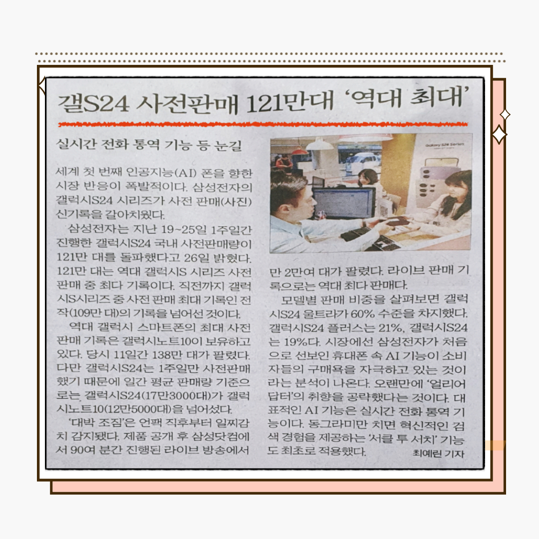 세계 첫 번째 인공지능(AI) 폰인 삼성전자의 갤럭시S24 시리즈가 사전 판매(사진) 신기록을 갈아치우며 폭발적인 시장의 관심을 갖고 있습니다.