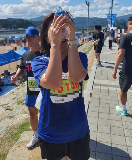 4번의 물 마시는 급수대가 있었는데 마지막 코스에서는 머리에 물을 부어버렸지 뭐예요.