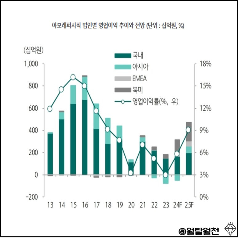 또한 해외 매출은 북미와 EMEA 지역에서는 본업 호조 및 자회사 코스알엑스의 실적 상승이 더해져 높은 성장세 기대된다고 하니 K 뷰티 대장주 아모레퍼시픽의 화려한 전성기가 다시 오길 기대해 봅니다.
