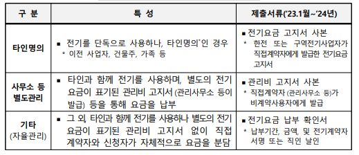 - 전기요금 계약종 : 전기요금 고지서에서 확인할 수 있으며, 일반용, 산업용, 농사용, 교육용 혹은 주택용 중 비주거용 전기요금을 부담하는 사업자