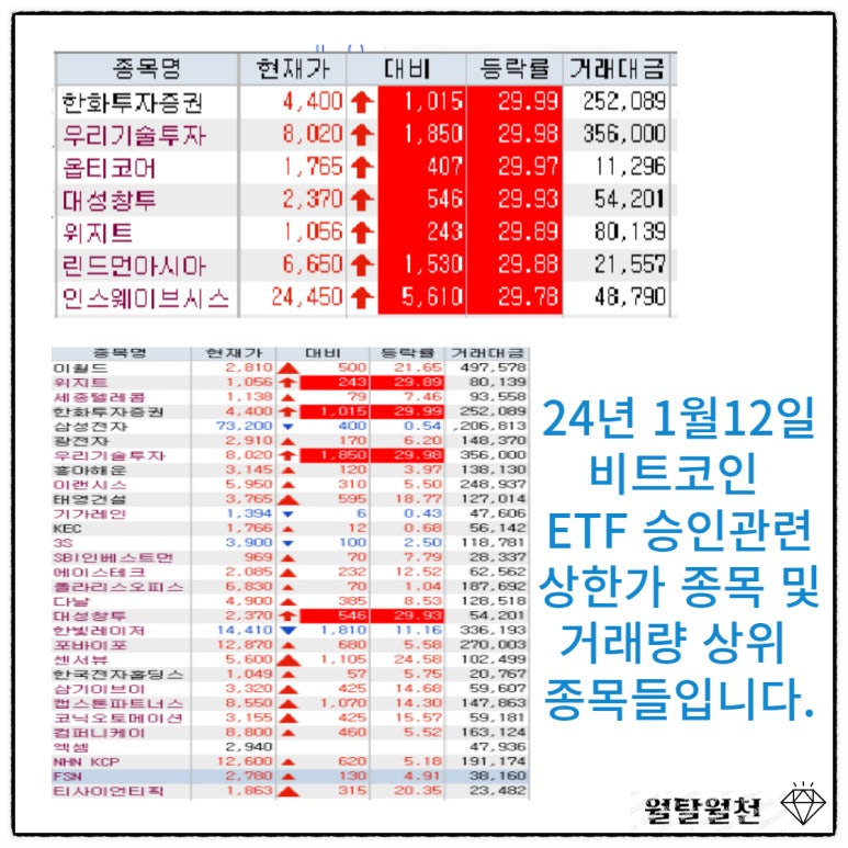지난해 말 상장한 비트코인 ETF를 보면 비트코인 현물 ETF 승인 기대감을 가격에 선 반영하며 100% 넘게 띄어 실제로 승인된 이후에는 비트코인 1개가 1억 원을 돌파했습니다.