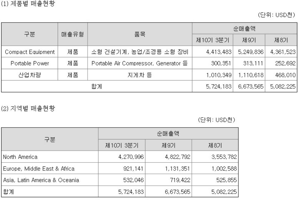 콤팩트(Compact) 건설기계 부문에서 SSL, CTL, MEX, 450여 개의 어태치먼트(Attachments) 등의 제품을 자체 디자인으로 개발, 제조하여 밥캣(Bobcat) 브랜드로 판매 중이며 목표시장은 주택건설, 농업, 조경 분야 등입니다.