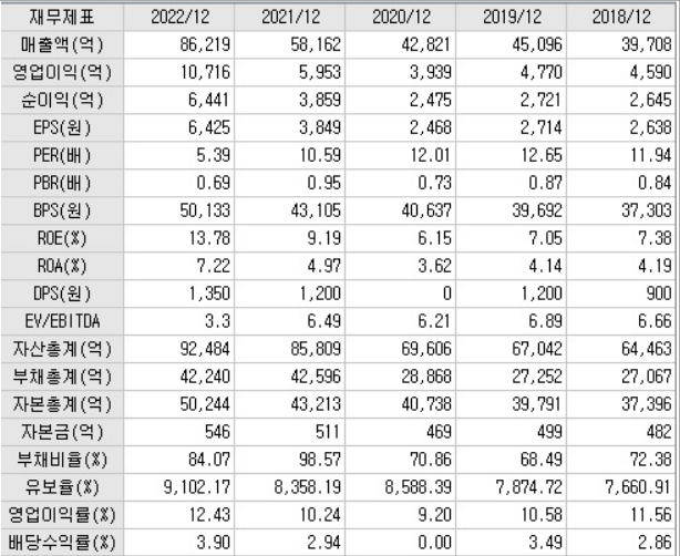 현재 주가 기준 4.66배이고, 매출액 및 영업이익이 매년 꾸준히 증가하고 있는 것을 볼 수 있습니다.