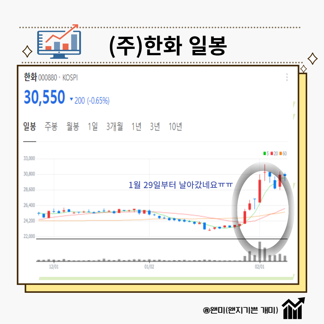 (주)한화는 상속 이슈로 주가가 억눌려 있다고 평가받는 대표적인 저 PBR 주였는데, 이번 정책으로 인해 1월 29일부터 주가는 좋은 반응을 보이고 있습니다.