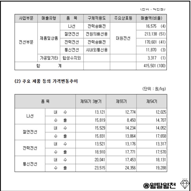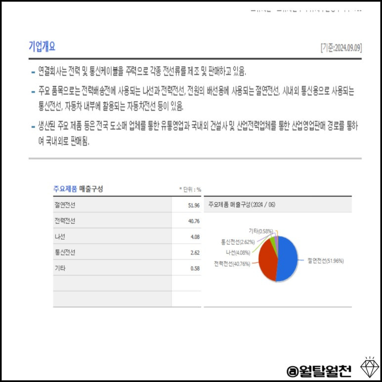 수출보다는 내수 비중이 높은 기업으로 절연전선이 51% 전력전선이 40%정도 매출 구성을 차지합니다.