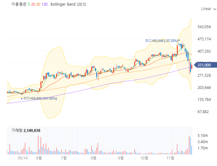 제약 바이오 대장주 알테오젠은 최근 10거래일 동안 34.46% 하락하여, 44만 5500원에서 29만 2000원으로 떨어졌습니다. 이는 시가총액이 약 8조 원 감소한 것을 의미합니다