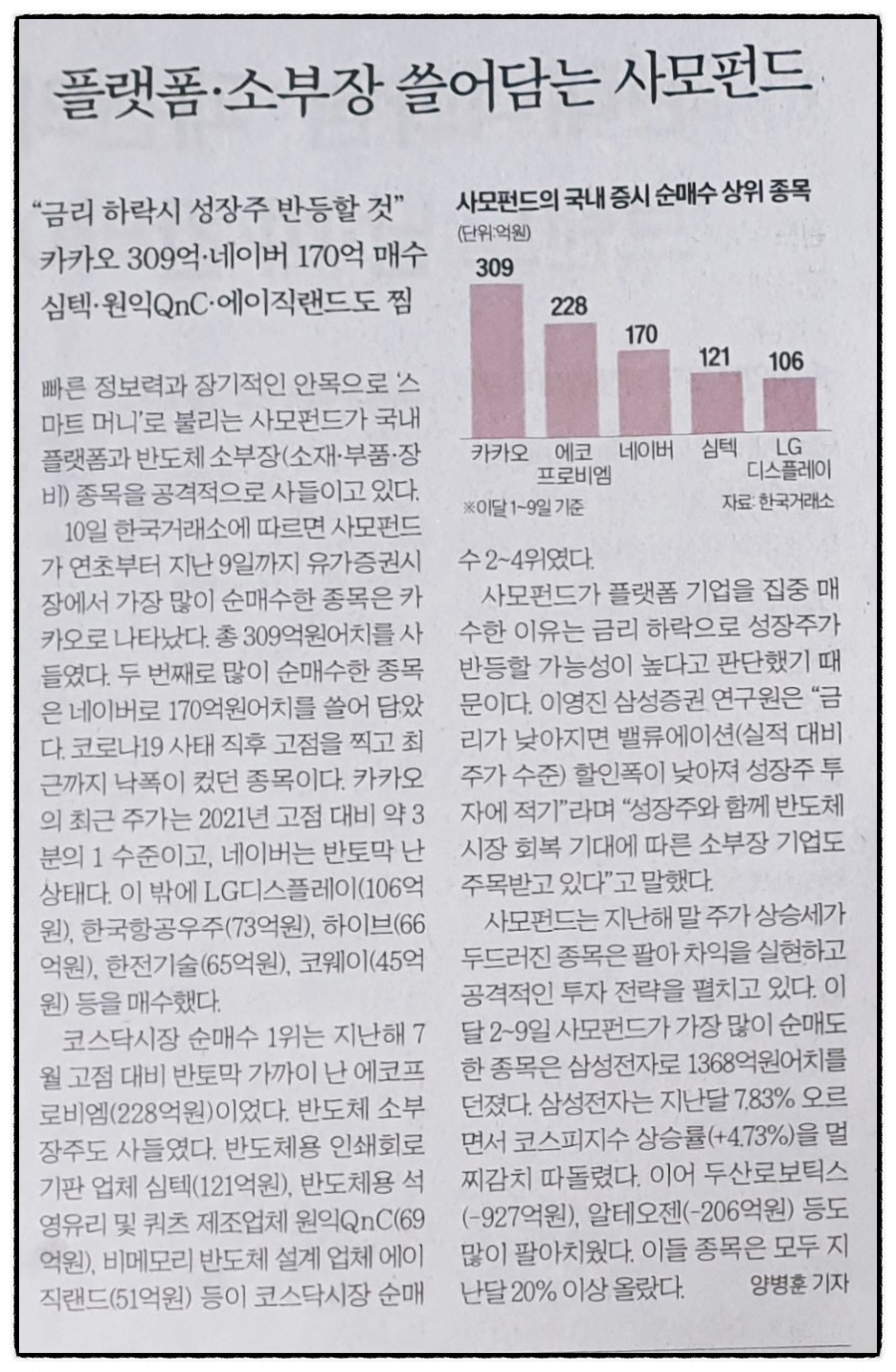 플랫폼 기업을 집중 매수하는 이유는 금리하락으로 성장주가 반등할 가능성이 높다고 판단했다고 합니다.