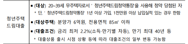 또한 청년 주택드림 청약통장을 이용해 청약에 당첨된 경우 분양대금의 최대 80%까지 2%대 낮은 금리로 대출해 주는 전용 대출상품인 청년주택드림대출을 지원(세부사항 24년 12월 확정 발표 예정)합니다.