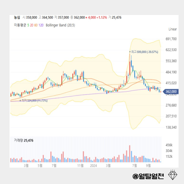 다음은 신라면으로 유명한 농심의 차트와 거래량입니다.