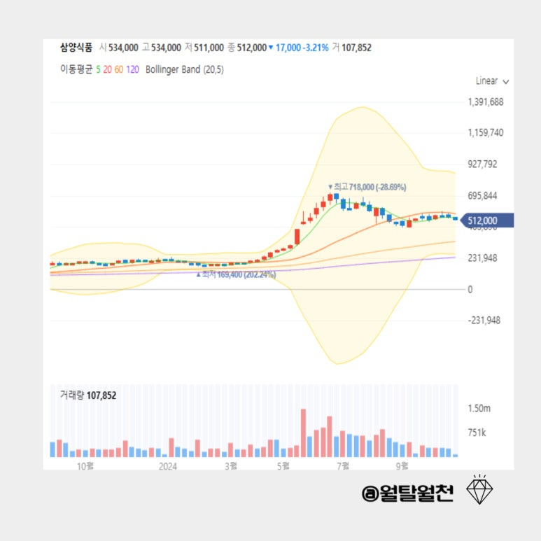 불닭볶음면으로 한때 이목이 집중되었던 삼양식품의 주봉차트와 기관 외국인의 거래량입니다.