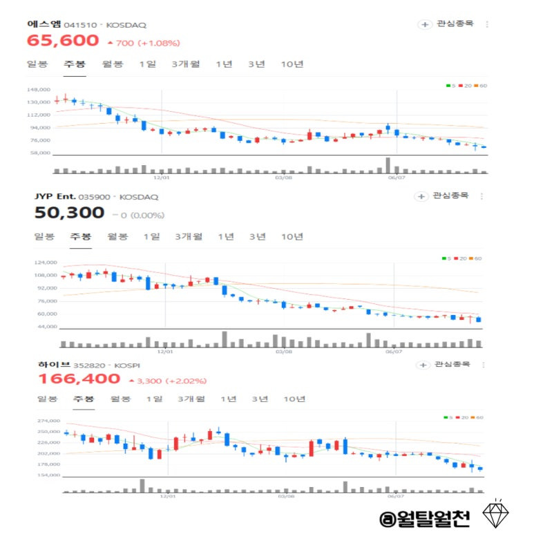 오늘 저기에서 언급한 종목들 주가를 한번 쭈~욱 봤는데 현재 바닥에 있는 종목은 엔터주들이더라구요.