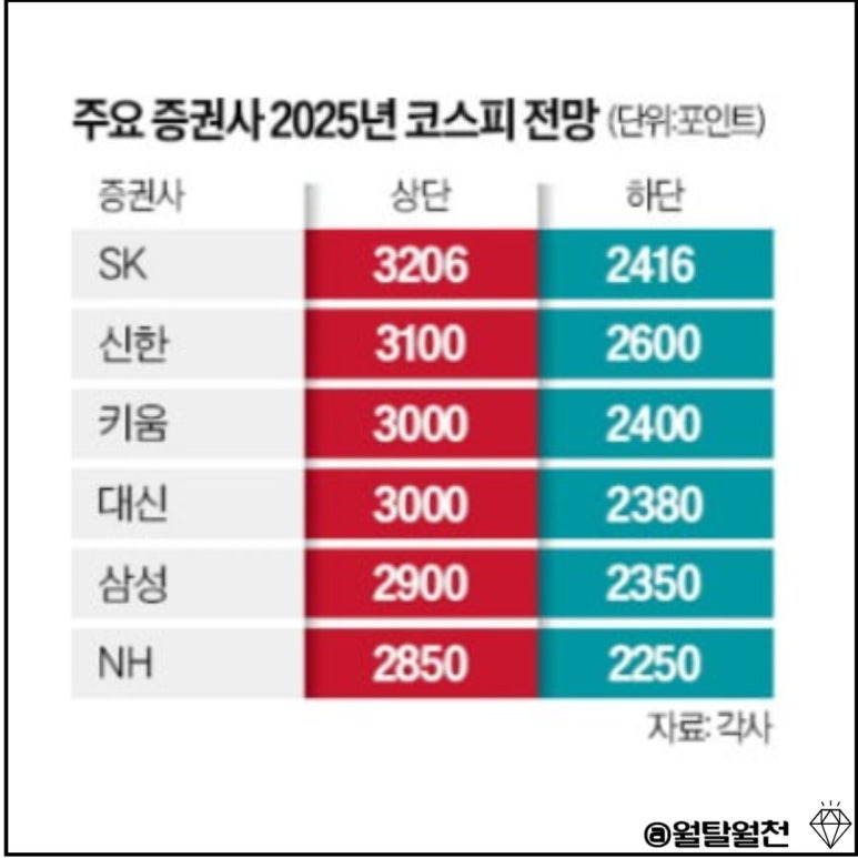 국내 주요 증권사들은 올해 코스피지수 상한선을 2850에서 3200까지 내다본다고 합니다.