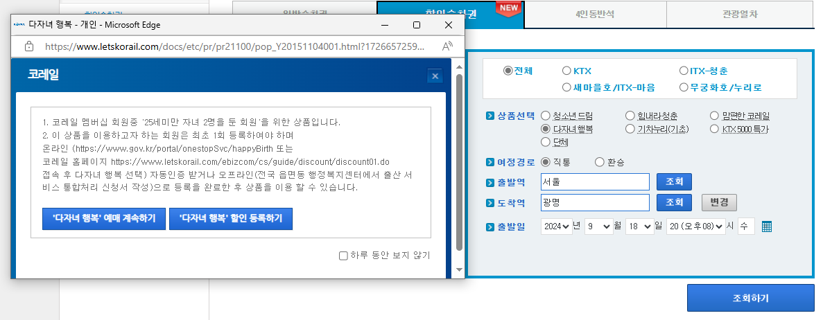 코레일 홈페이지에 접속하여 할인승차권에 다자녀행복을 클릭하면 아래와 같은 배너가 뜹니다.